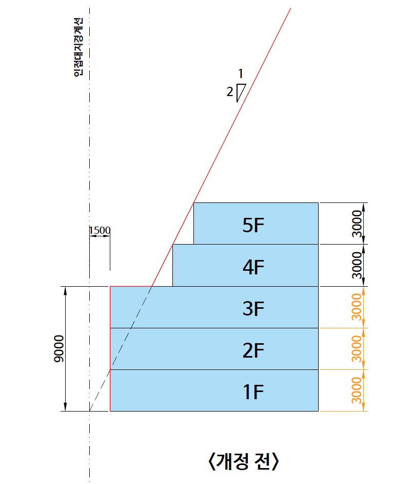기존에는 높이 9미터 이하인 부분에서 인접대지경계선으로 부터 1.5미터 이상 이격하고 9미터를 초과하는 부분은 해당 건축물 각 부분 높이의 2분의 1이상을 이격해야 했다.